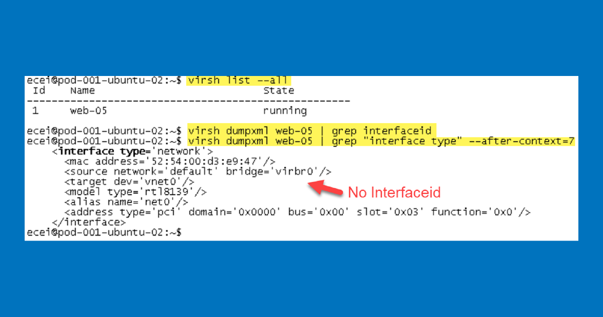 virsh dumpxml web-05 | grep “interface type” –after-context=10Awesome we now have an interfaceid 😉