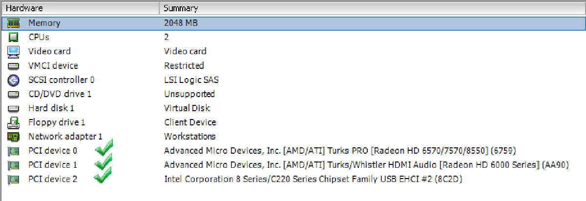 To begin I need to passthrough the AMD HD6570 and USB EHCI #2 (diNovo USB dongle). From the vCenter web client Select ESXI03 -> Click Manage tab -> Settings -> Hardware -> PCI Devices -> Click Pencil (edit) -> Select devices -> Reboot ESXI03: