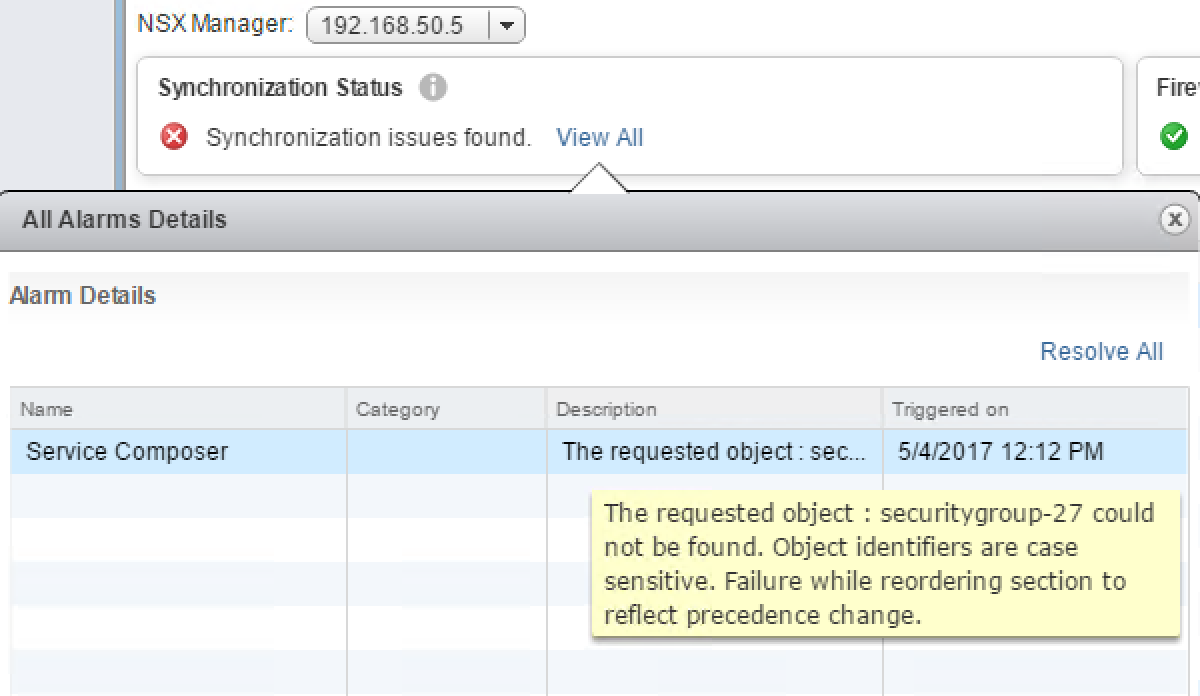 Since NSX Service Composer can’t synchronize with the DFW we’re unable to edit the Security Policy and remove the “bad” Security Group. While we can’t synchronize anything, the environment is still functioning we just can’t make changes to Security Policies until the issue is resolved.