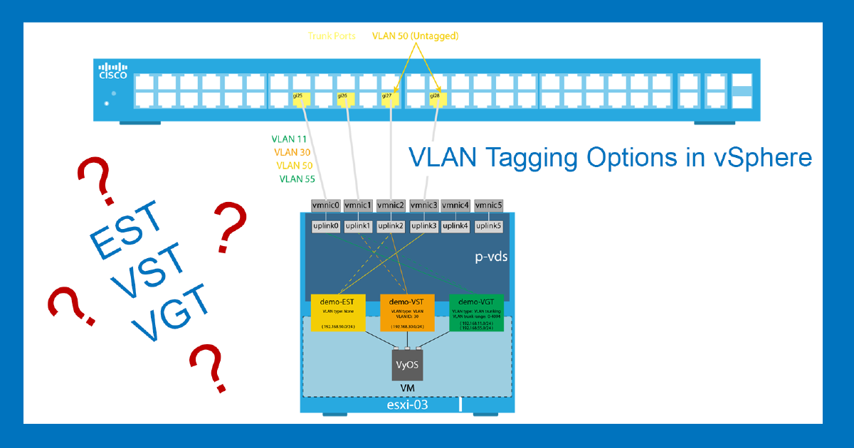 Hey Everyone, in today’s video we’re talking External Switch Tagging (EST), Virtual Switch Tagging (VST), and Virtual Guest Tagging (VGT). If you’re wondering what these mean then stick around as I walk you through the different VLAN tagging options in vSphere.